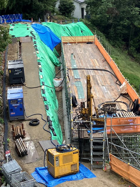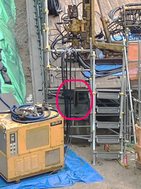 少し判り難いのですが、基礎に空けていた孔をから、地中に特殊杭を打ち込んでいます。
