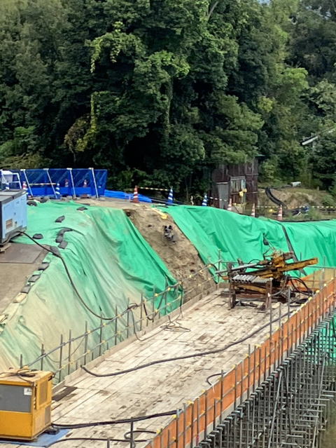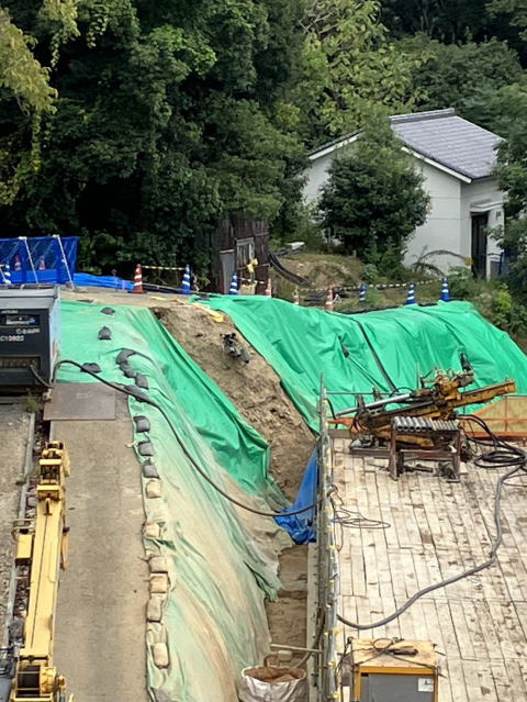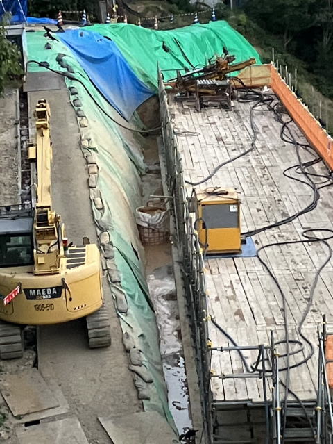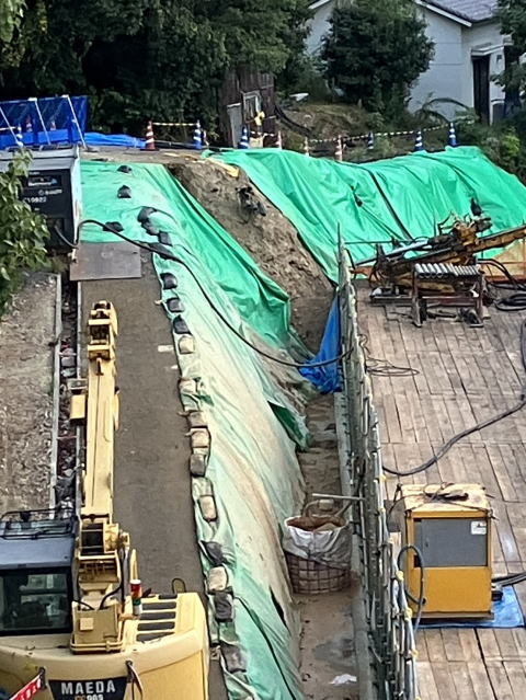 | 工事施工状況 | またしても小規模な崩落発生。 作業工台は単管にて組まれているが、横方向からの力は考慮していないはずなので 作業工台の安全性が確保されていないと思われる。安全管理に疑問あり。 |