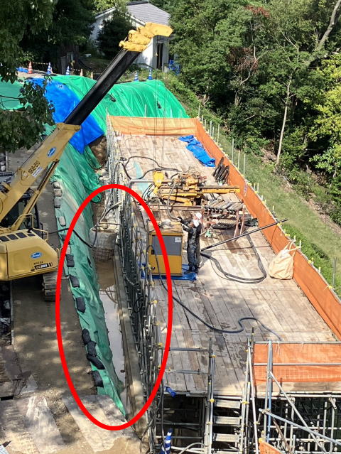 昨日までの3日間午前中に降水の影響と思われる水が擁壁背面に溜まっています。