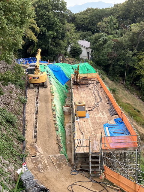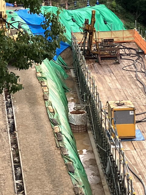 | 工事施工状況 | またしても小規模な崩落発生。 作業工台は単管にて組まれているが、横方向からの力は考慮していないはずなので 作業工台の安全性が確保されていないと思われる。安全管理に疑問あり。 |