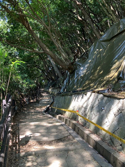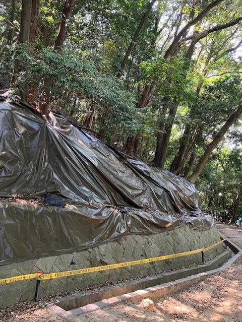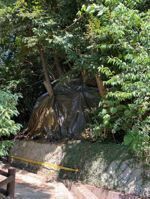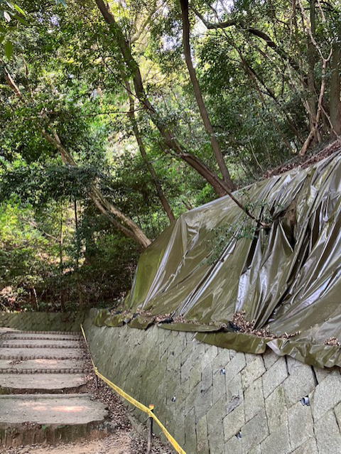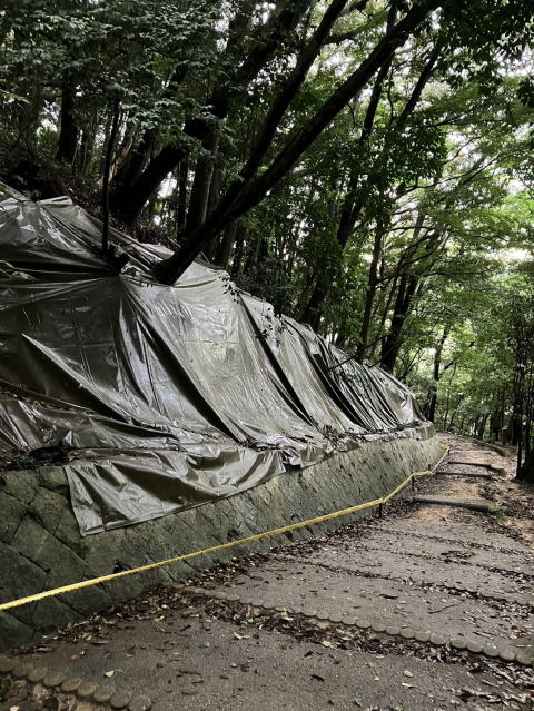 日時・場所 令和7年8月20日・古町口登城道 状況と対応 擁壁上部のクリープの発生していると思われる個所。 シートがかけられていました。 行政側からの回答及び対応 ー